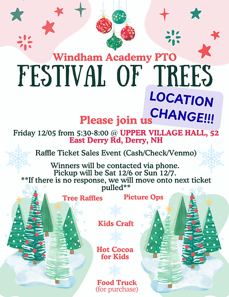 There has been a location change due to unforeseen circumstances. Please note the new location for the Festival of Trees is at the Upper Village Hall, 52 East Derry Road, Derry, NH. This is the same location that we had it last year.